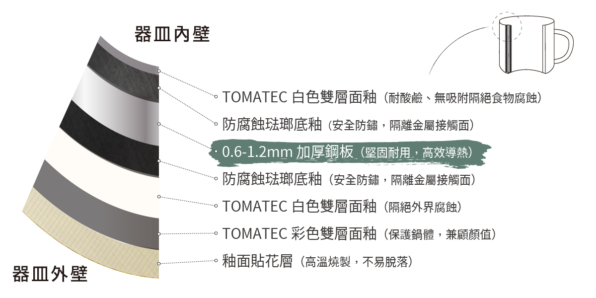 ◉採用日本TOMATEC株式會社;業界以良好的密著性能和高亮光澤度著稱;施以3-6層琺瑯釉,比一般琺瑯商品多2層。