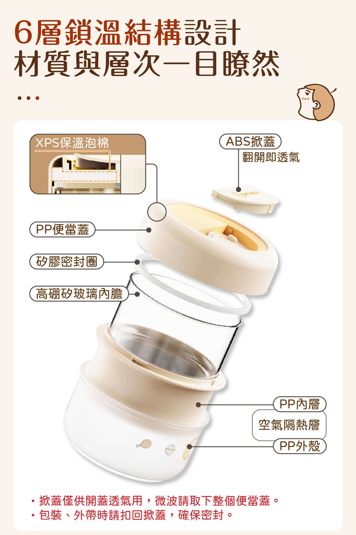 材質/掀蓋-ABS;盒蓋、盒身外部-PP;透氣孔、密封圈-食品級矽膠;內膽-高硼矽玻璃;盒蓋內保溫材料-XPS(聚苯乙烯樹脂)