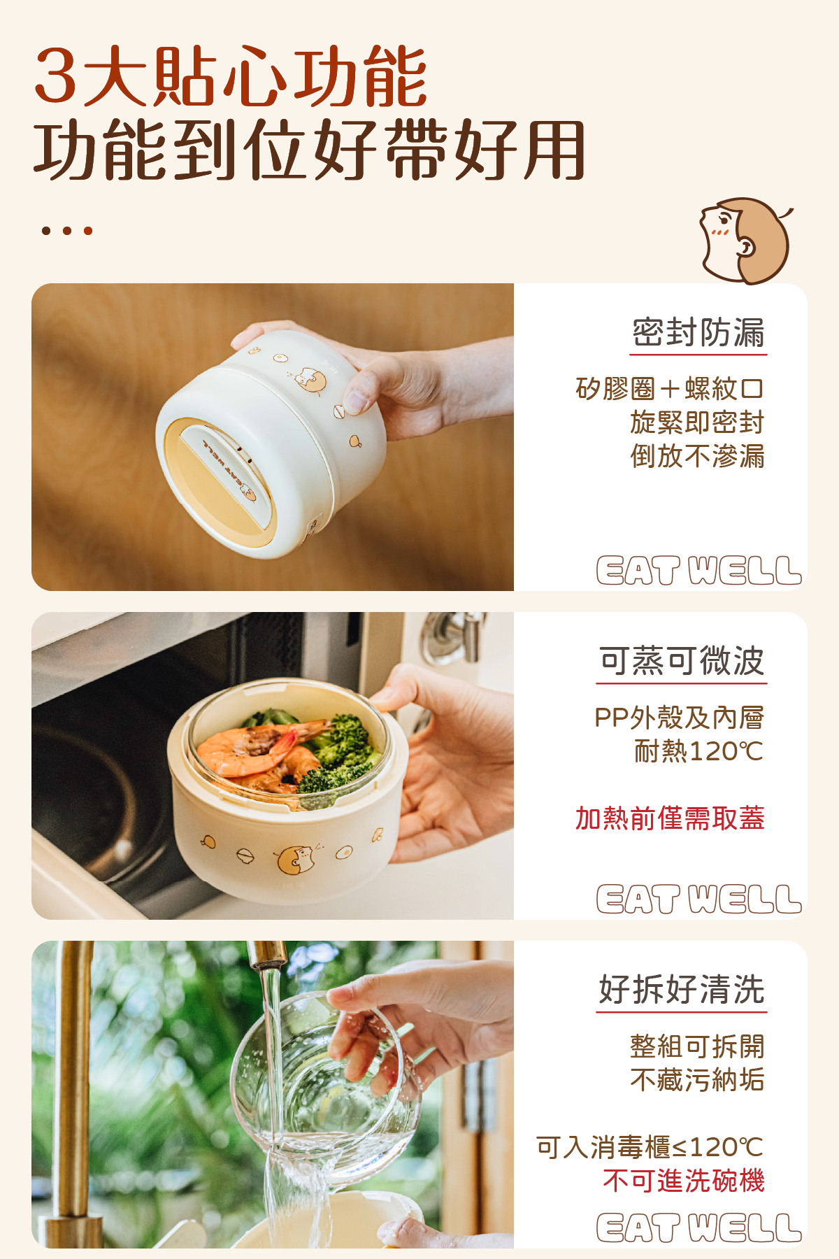 ◉整體耐熱約 120°C,適用微波爐、消毒櫃、冰箱。微波前請取下整個上蓋,避免密封加熱與上蓋變形。