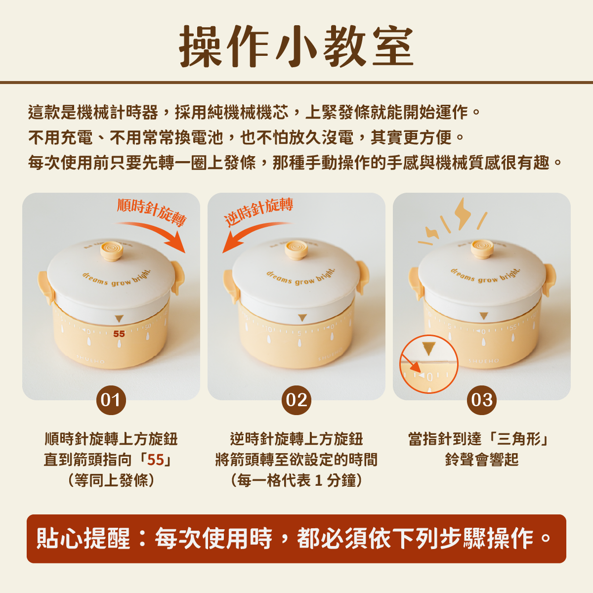 ◉正確開啟計時的兩步驟:先順時針預上發條至最大刻度附近(勿超過0),再逆時針轉回到欲設定時間;若直接轉到時間,鬧鈴可能不響。