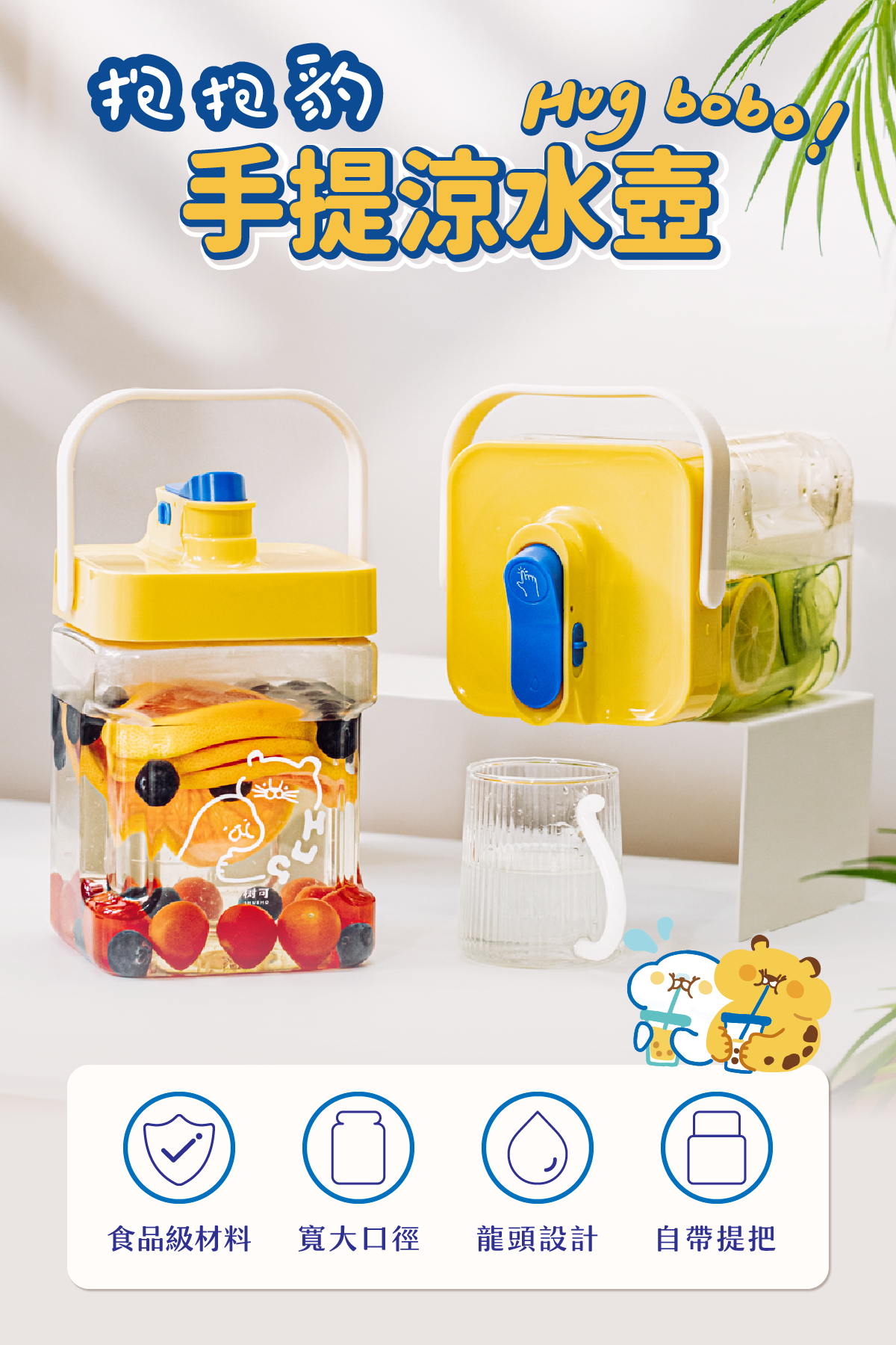 材質/壺身—AS;壺蓋、提手—PP;龍頭蓋、鎖扣—ABS;密封圈—矽膠;彈簧—304不鏽鋼