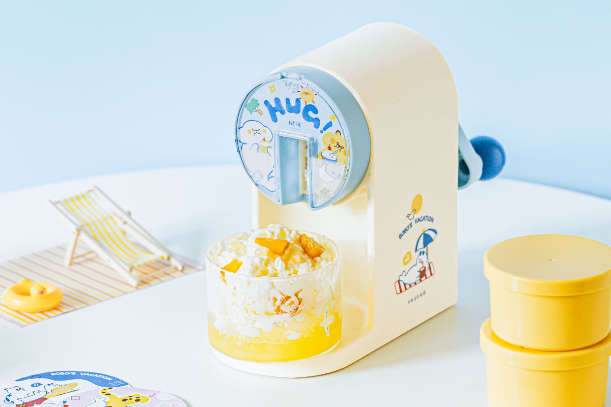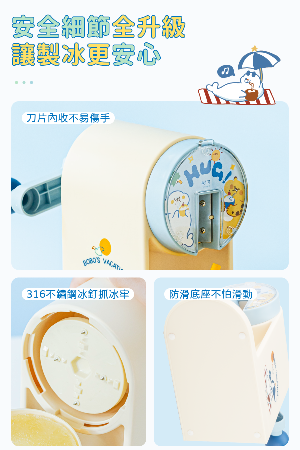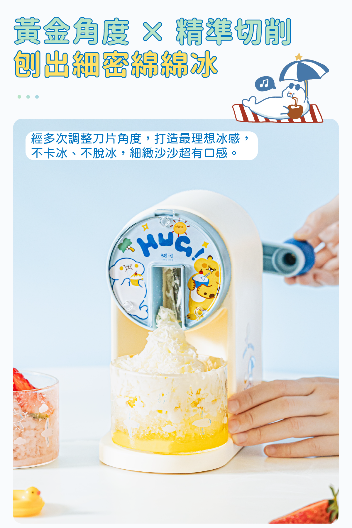 ◉刨冰時冰沙從側邊出冰口落下,易偏堆一側,建議邊刨邊旋轉容器,建議使用自製冰磚或冰塊效果最佳,高糖高纖飲品冷凍後冰感較鬆散,壓板齒面接觸底板時會產生輕微刮痕與殘冰,為抓冰式結構設計的正常狀況。