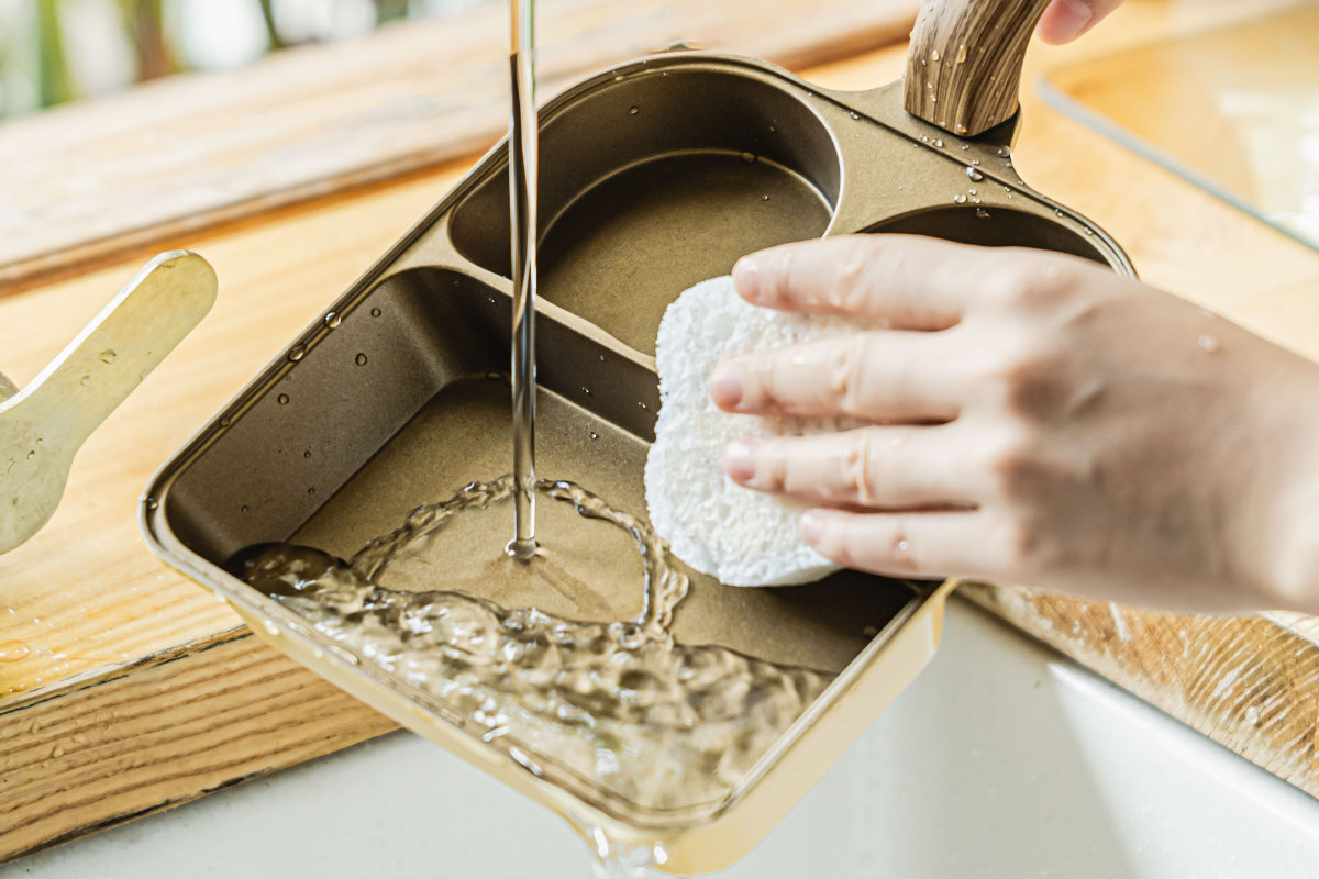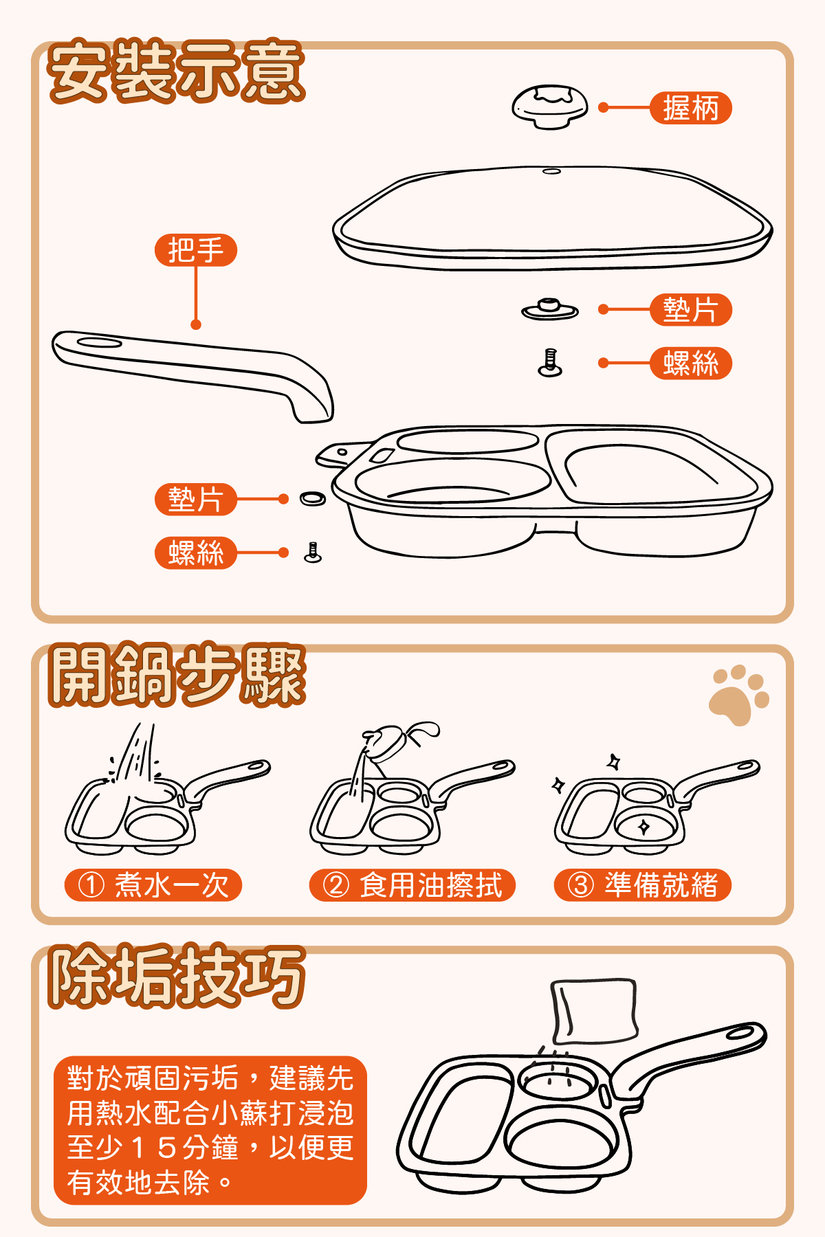 ◉烹調後讓鍋體自然冷卻再清洗,勿以冷水沖熱鍋;清潔時使用軟布或絲瓜布,避免硬刷、鋼絲球與強酸鹼清潔劑。