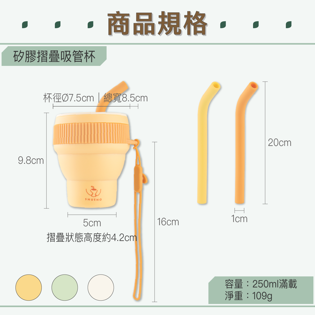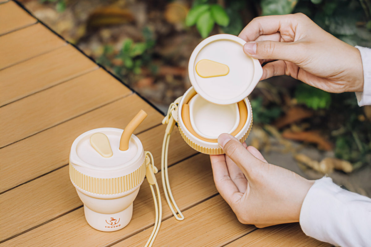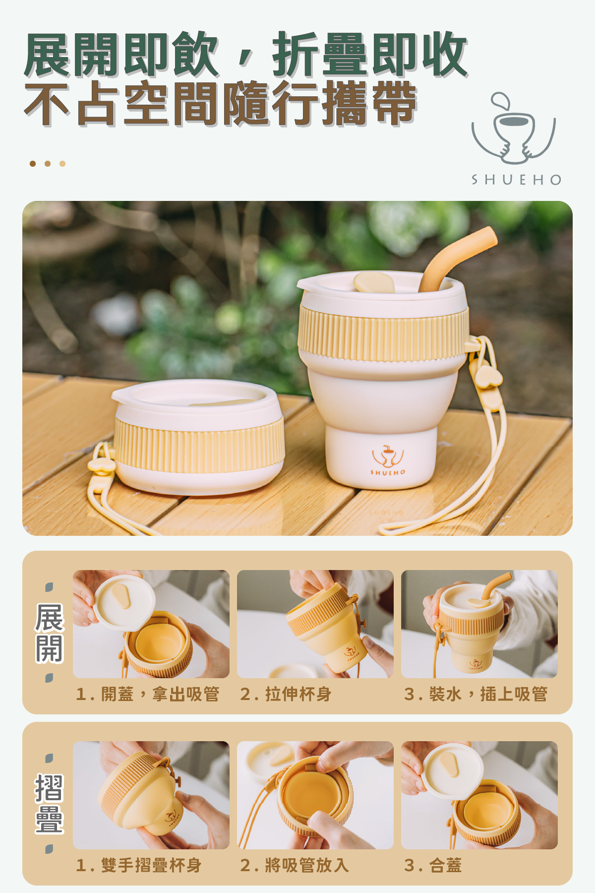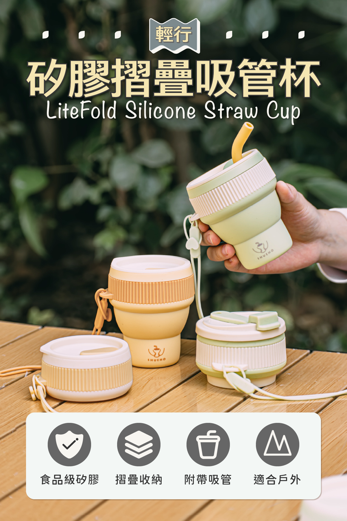 材質/摺疊杯、杯蓋、吸管、掛繩—矽膠;隔熱套:PP