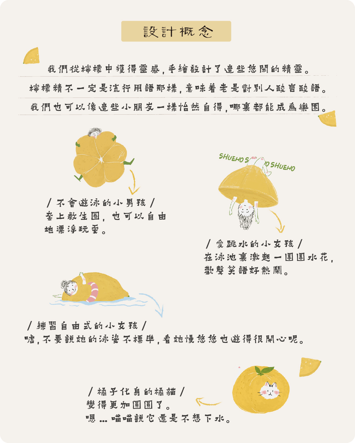 我們從檸檬中獲得靈感,手繪設計了這些悠閒的精靈。