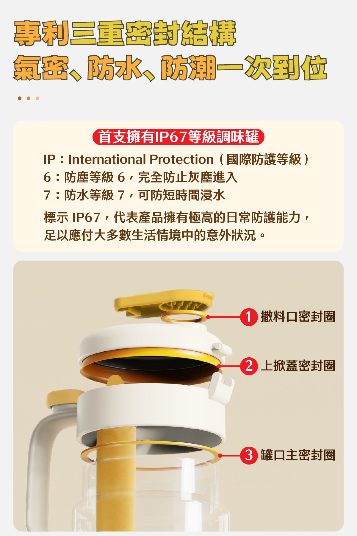 ◉縱使罐體容量大、密封效果優異,但頻繁開闔仍可能讓調味料受潮。建議依日常用量適度裝填,並可搭配矽藻土乾燥塊使用,讓調味料更長久保持乾爽。