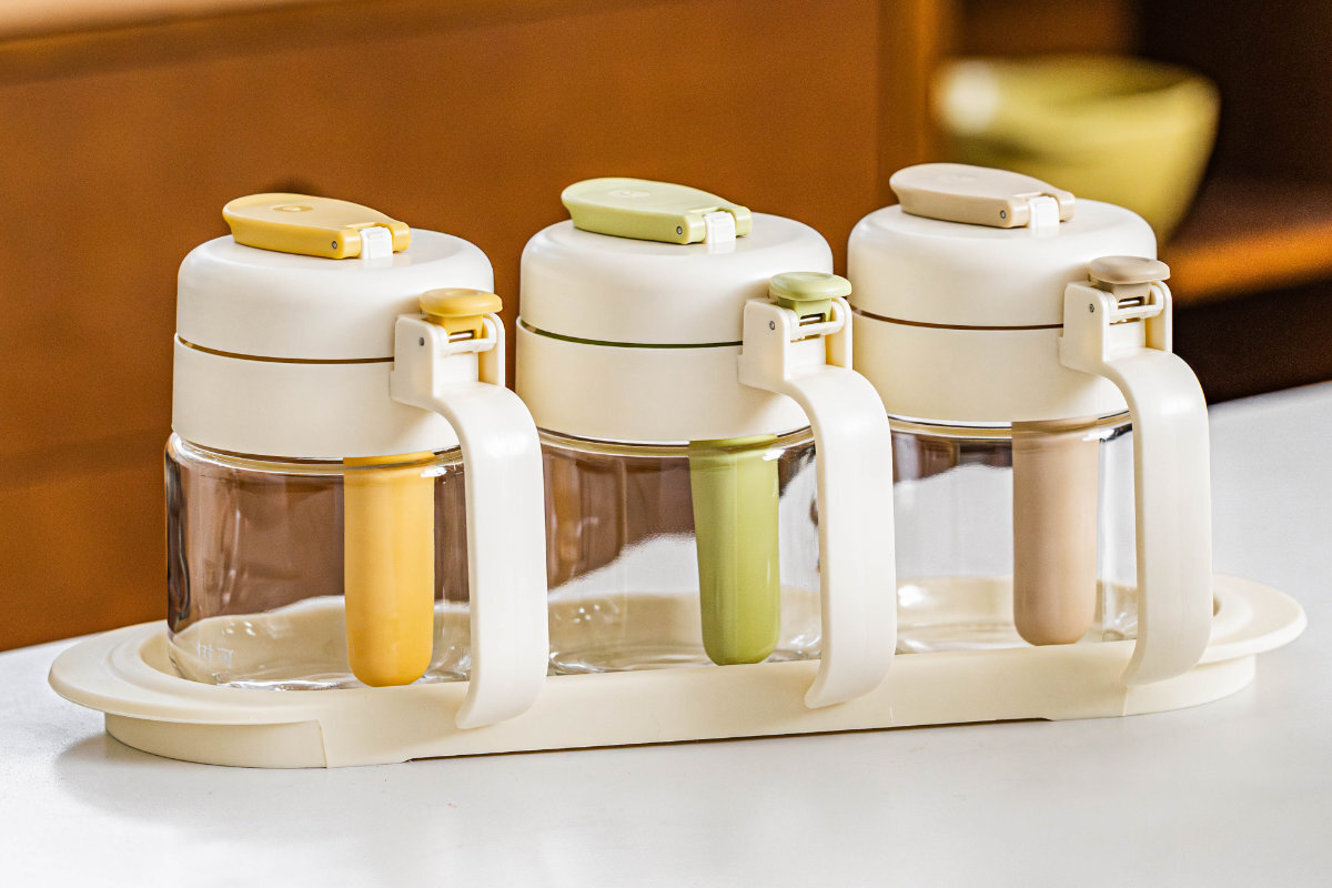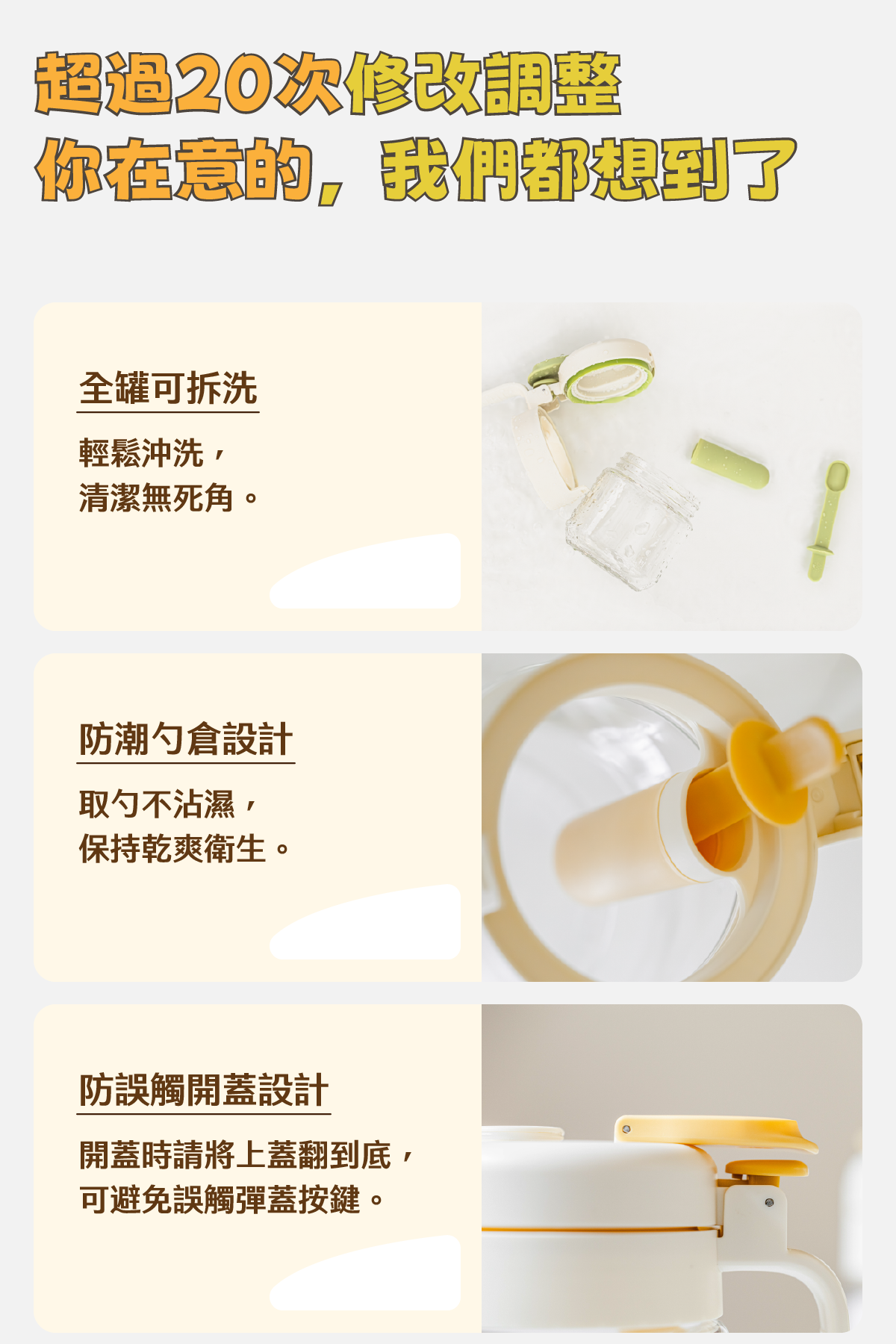 材質/翻蓋、上蓋外殼、開蓋連動件、彈蓋按鈕、手柄-ABS;上蓋基座、上蓋內壁、勺倉、勺子、托盤-PP;密封圈-食品級矽膠;罐身-中硼矽玻璃