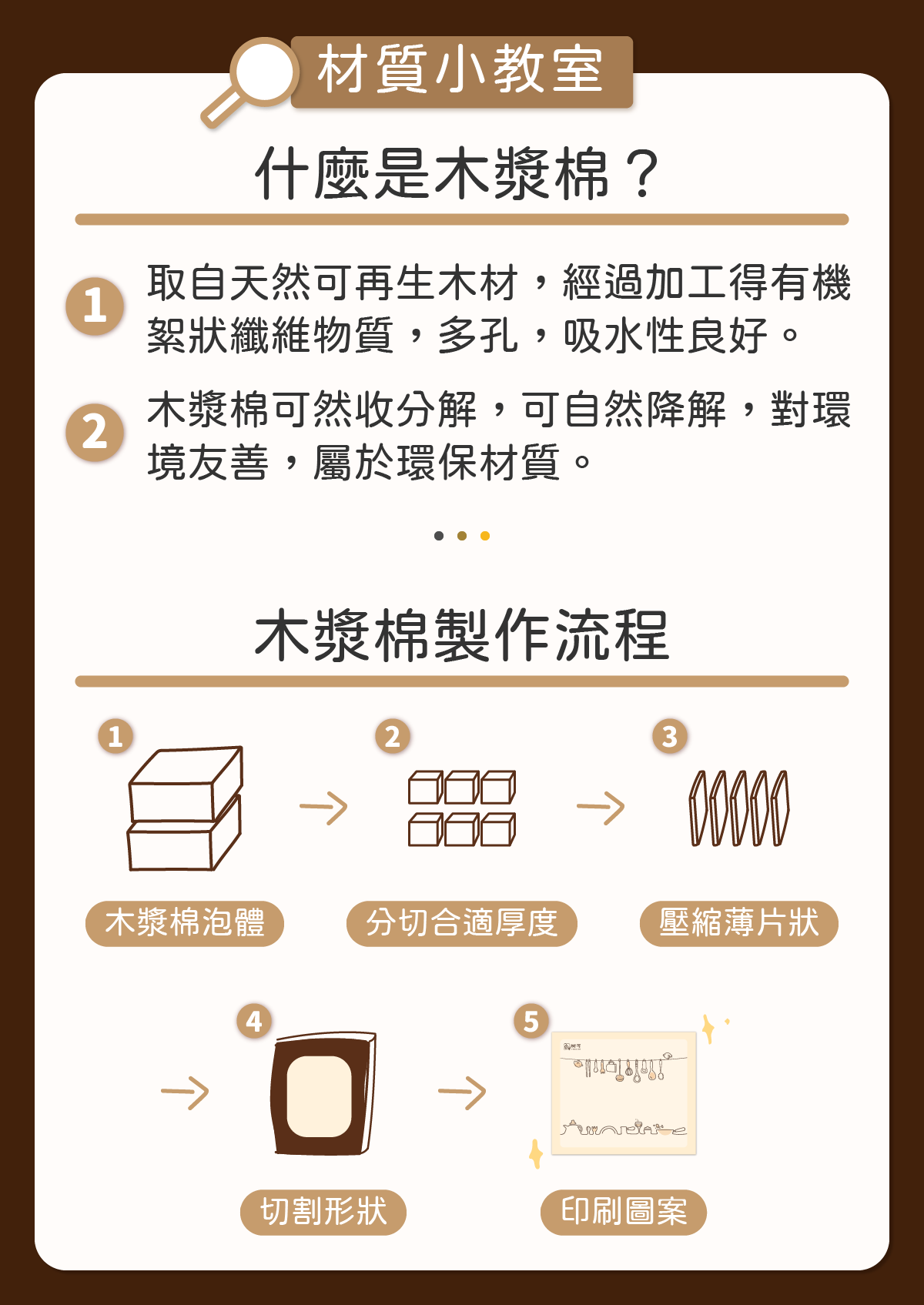 ◉木漿棉表面會有白色凹凸絮狀或是褐色小點,是木質纖維素本身帶有的天然材質。